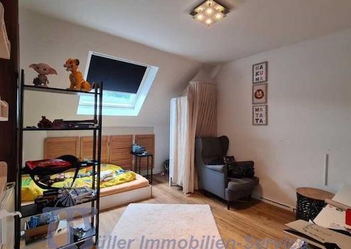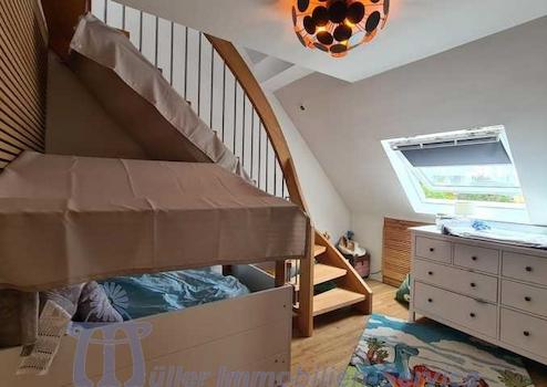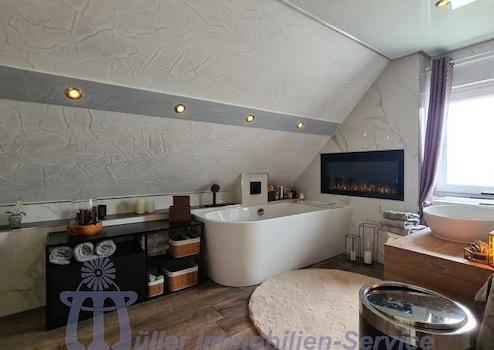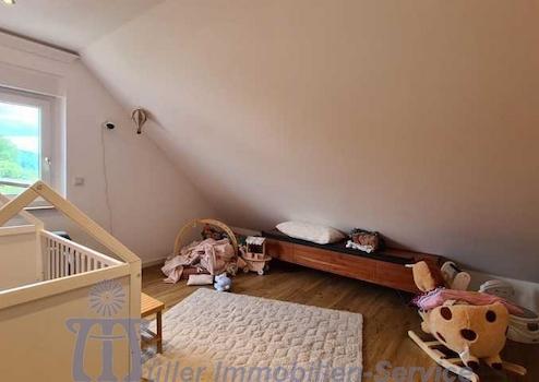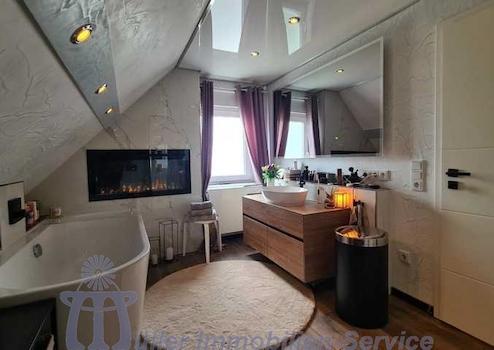 2 Kinderzimmer, Spielzimmer mit Treppe zum ausgebauten Dachgeschoß, modernes luxuriös ausgestattetes Bad (Wanne, Dusche, großer Waschtisch mit Spiegel, versteckt angeordnetes WC, dekorativer Elektrokamin, weiße Hochglanz-Spanndecke mit Spots)