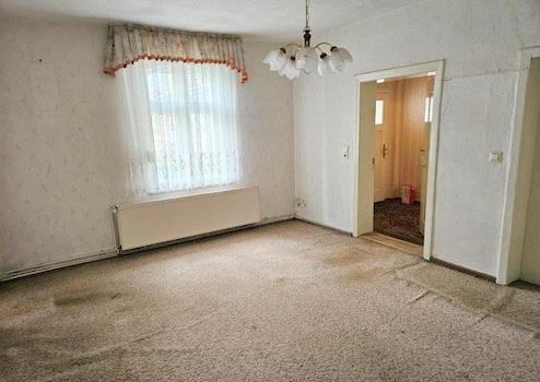 Vom Flur gelangt man rechts in das Schlafzimmer und in das Bad mit Wanne. Die Warmwasserherstellung erfolgt über einen Elektroboiler. Die Fenster sind zur Straße hin alte Doppelkastenfenster und zur Hofseite nur mit nur einer Scheibe verglast. In den Räumen stehen funktionierende Kachelöfen. Die Beheizung der Wohnräume erfolgt allerdings mit einer funktionierenden Ölheizung. Die Heizung und die 2 Öltanks sind über den Innenhof erreichbar. Über den Innenhof erfolgt auch die Ölanlieferung. Das Haus ist ursprünglich mit Lehmdecke errichtet worden und weist einen deutlichen Modernisierungsbedarf auf. Das Haus ist teilweise unterkellert, mit niedrigen Deckenhöhen. Über den Wohnräumen befindet sich ein ausbaufähiges Dachgeschoss, allerdings ohne jegliche Isolierung. Das Dach ist in einem soliden und dichten Zustand. Über den Innenhof gelangt man in den Heizungsraum und in diverse weitere Nebengelasse, die vormals, landwirtschaftlich genutzt wurden. Straßenseitig neben dem Haus ist eine mit Dachboden versehene Einfahrt, über die man in den Hof gelangt und weiter geradeaus in eine geräumige Scheune. Hier befindet sich auch noch ein kleiner Rübenkeller. Die Scheune hat zum schönen Garten hin eine Torausfahrt. Es handelt sich um einen sehr schönen Garten weitem Ausblick in die Natur.