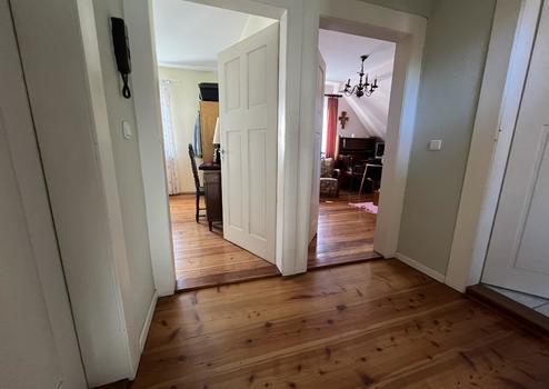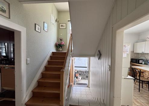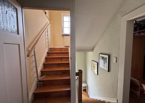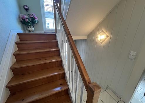 Die Holztreppe und der Dielenboden geben dem Haus einen Altbau-Charme und laden zum gemütlichen Wohnen ein.