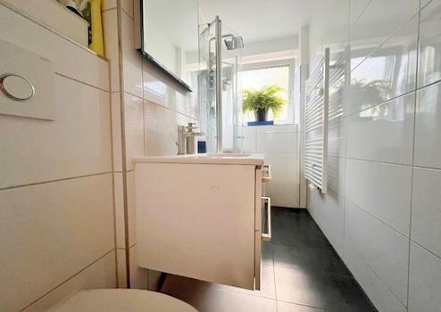 Zur östlich ausgerichteten Seite befindet sich das Tageslicht-Duschbad, das in 2014 modernisiert wurde und in diesem Zusammenhang mit anthrazitfarbenen Boden-, weißen Wandfliesen im aktuellen Design und einer bodengleichen Dusche ausgestattet wurde.
