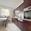 In der angrenzenden Küche wurde eine dunkle Einbauküche mit elektrischen Geräten wie Kühl- und Gefrierkombination, Herd mit Induktion-Ceranfeld, Ofen, Geschirrspülmaschine und Waschmaschine eingebaut. Der Raum bietet genügend Platz für einen kleinen Esstisch und gewährt einen angenehmen Blick ins Grüne.