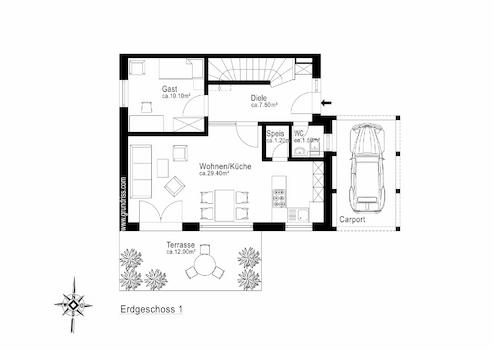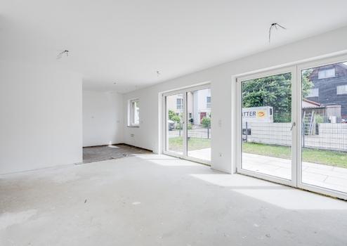 Ein offenes Raumkonzept im Erdgeschoss mit fließendem Übergang von Wohnen, Kochen und Essen gehört ebenso zum Standard wie ein Gäste-WC im Eingangsbereich sowie einem Gäste-Zimmer/Büro.