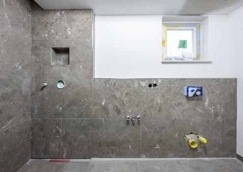 - Design-Bäder mit Feinsteinfliesen, Handtuchheizkörpern und hochwertiger Badkeramik von Villeroy & Boch sowie Armaturen von Hans Grohe
