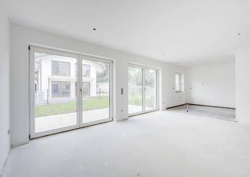 In der Fassade bestimmen überwiegend bodentiefe Panoramafenster das Bild – sie lassen erahnen, wie einladend lichterfüllt sich jeder Raum präsentieren wird.