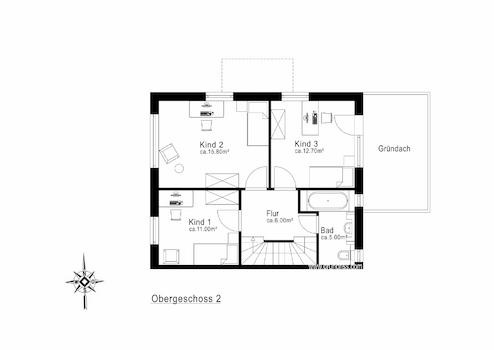 Im Obergeschoss wird das moderne Wohnkonzept weiterhin kompromisslos umgesetzt. Neben einem geräumigen Flur sowie einem Masterbad mit Badewanne, erstreckt sich die Etage um drei Schlafzimmer.
