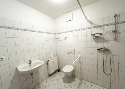 Das modern ausgestattete Badezimmer verfügt über eine barrierefreie Dusche und erfüllt alle Ansprüche an zeitgemäßen Komfort.