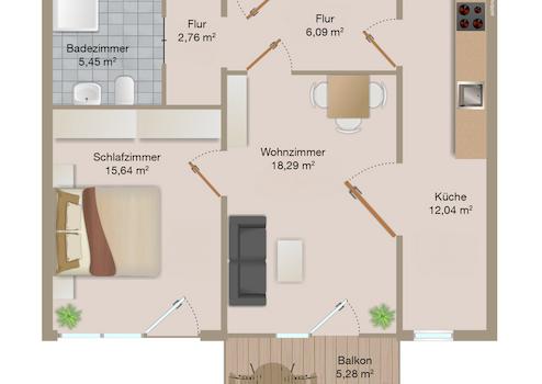 Ein praktisch geschnittener Flur verbindet alle Räume effizient miteinander. Das lichtdurchflutete Wohnzimmer bildet den Mittelpunkt der Wohnung und bietet direkten Zugang zum ca. 5,3 m² großen Balkon – ein angenehmer Rückzugsort im Freien mit Platz zum Entspannen.
