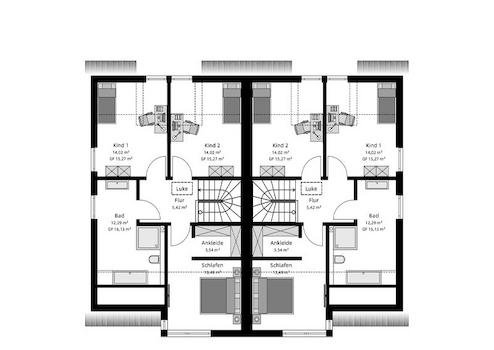 Dieser repräsentative Doppelhausentwurf mit Satteldach zeichnet sich durch seine besondere Gestaltung aus, die einen Zwerchgiebel mit Flachdach und einen Erker mit Flachdach einschließt. Das Highlight dieses Hauses ist zweifellos die Küche, die sich an der Vorderseite des Gebäudes befindet. Sie bietet nicht nur Fenster, die einen Blick in zwei Richtungen ermöglichen, sondern auch genügend Platz für einen Kochtisch in der Mitte. Die großzügige Fläche von 16 m² macht die Küche zu einem Ort, an dem man gerne Zeit verbringt, und das Übereckfenster sorgt dafür, dass Sie das Leben auf der Straße im Auge behalten können. Statt einem Technikraum, der in den Keller verlegt werden könnte, bietet ein in Büro oder ein Gästezimmer mit knapp 10 m² eine großzügige Nutzmöglichkeit. .