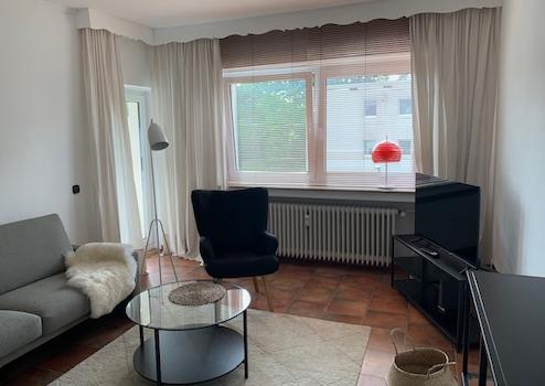 Der Wohnraum beherbergt neben der Sitzlandschaft einen Essbereich. Die Einrichtung besteht aus zeitlos-modernen Designer-Möbeln, die mit stilsicherem Geschmack modernes Wohnambiente bieten. Der Balkon vor dem Wohnzimmer erweitert diesen Raum an den warmen Tagen nach Außen und bietet weitere Wohnqualitäten für Erholung und Gastlichkeit.