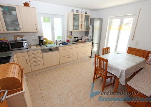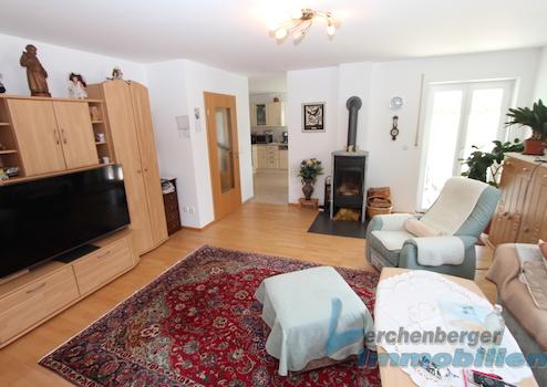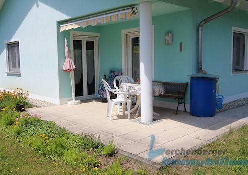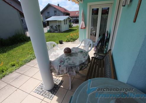 Von der Küche und vom Wohnzimmer aus kann man die teilüberdachte Terrasse begehen. Diese ist mit ca. 10 m² nicht in der Wohnflächenberechnung erfasst.