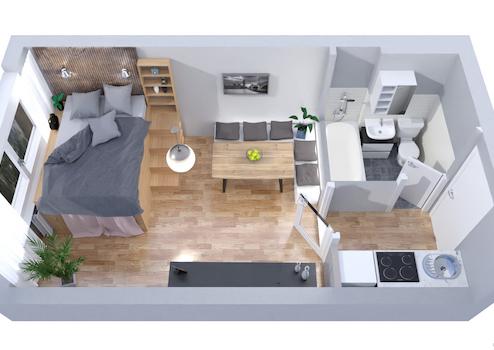 •Zimmer-Apartment mit intelligentem Raumkonzept für maximale Nutzung der Fläche.