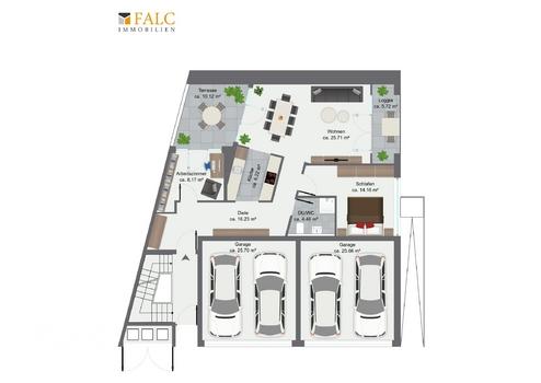 • Terrasse/Loggia: Ostterrasse (ca. 10 m²), Westloggia (ca. 5,7 m²)