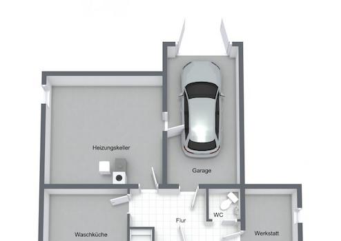 Kellergeschoss: Garage, Heizungskeller, Flur, WC, Waschküche, Werkstatt