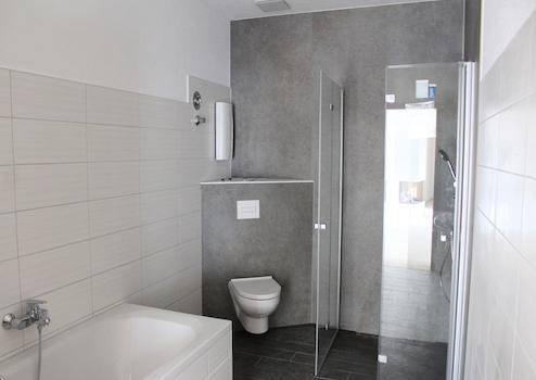 Mehrfamilienhaus, 3 Zimmer, 1. Obergeschoss, Flur, Kinderzimmer, Wohnzimmer mit offener Küche, und Gaskamin, Bad mit Wanne, Dusche, WC, Handwaschbecken, Handtuchheizkörper