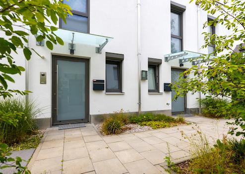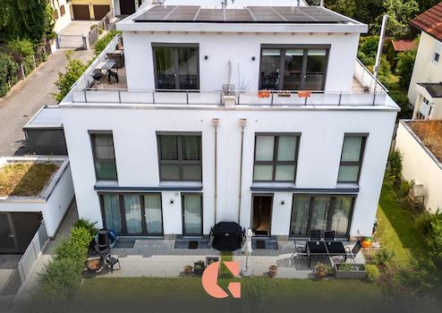 Dieses junge Doppelhaus mit Süd-West-Ausrichtung wurde 2020 in Ziegelbauweise in einer ruhigen Wohngegend Truderings errichtet. Der Garten ist mit Rollrasen ausgestattet und eingerahmt von einer Ligusterhecke.