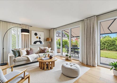 Die lichtdurchfluteten Wohnzimmer sind geöffnet zum Küchen- und Essbereich. Dieser ist mit einer hochwertigen Einbauküche mit Natursteinarbeitsplatte, flach bündigem Induktionskochfeld, Kopffrei-Dunstabzugshaube, Spülmaschine, integriertem Kaffeevollautomaten (alle Siemens) und einem doppeltürigen Kühlschrank ausgestattet. Im Wohnbereich kann mit dem Kaminofen eine behagliche Wärme erzeugt werden.