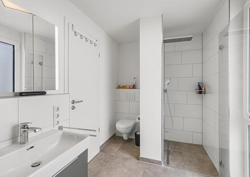 Im Obergeschoss befinden sich die Dusch- und Wannenbäder mit Fenster, Kinderzimmer und die großzügigen Elternschlafzimmer.