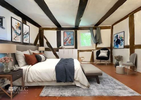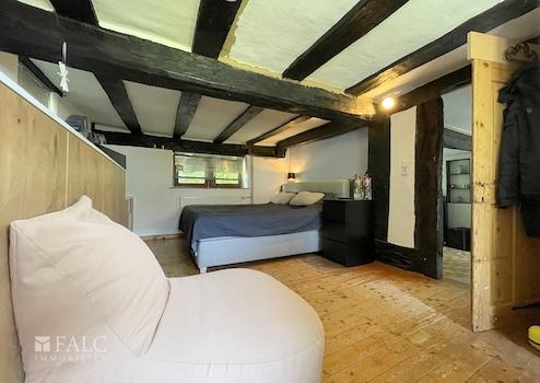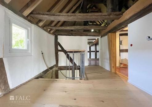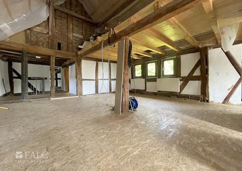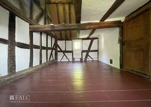 Aufgrund der traditionellen Fachwerkkonstruktion variiert die Deckenhöhe in einigen Bereichen des Hauses. Insbesondere im Bereich der Balkenlage kann die Raumhöhe teilweise niedriger ausfallen als in modernen Neubauten. Diese architektonische Besonderheit verleiht dem Objekt jedoch seinen charmanten, historischen Charakter und trägt zum einzigartigen Wohnambiente bei.