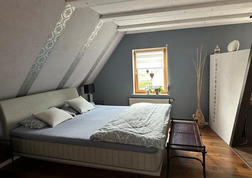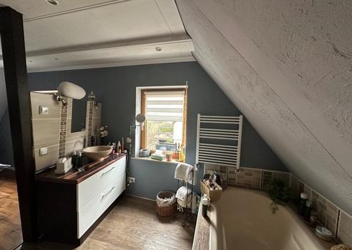 Im offen gestalteten Obergeschoss finden sich das Ankleidezimmer, sowie das Schlafzimmer mit Zugang zum geschmackvoll eingerichteten Wannenbad mit Regendusche und Fenster. Eine Aufteilung des Schlafzimmers in zwei kleine Zimmer ist durchaus nachträglich möglich.