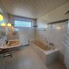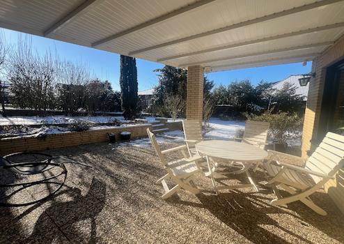 Die Treppe nach unten führt Sie in einen ähnlich großen Flur wie oben, von hier aus geht es zum einen ins Gäste WC, den Hauswirtschafts-/Heizungsraum, welcher die Gasbrennwertheizung (aus 2003) beherbergt und den zum Partykeller ausgebauten Raum mit Theke und Ausgang nach draußen und zum anderen in die großzügigen Wohn-/Essbereich mit teilweise bodentiefen Fenstern, mit Kamin und die Küche (ohne Einbauküche) und Vorratsraum (leer ohne Decke). Wohn-/Esszimmer (ohne Laminat und Türzagen) haben große Fensterfronten und Terrassentüren, sodass ausreichend Tageslicht und die Möglichkeit nach draußen in den Garten oder die überdachte Terrasse zu gehen zur Verfügung steht. Der Wohnkomplex bringt alles mit, was zum gemütlichen und relaxten Wohnen notwendig ist.