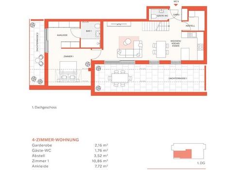 Das 1. Dachgeschoss beherbergt Garderobe, Flur, Abstellraum, Bad, Schlafzimmer mit Ankleide und