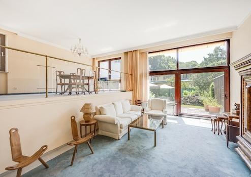 Im Erdgeschoss befindet sich das lichtdurchflutete Wohnzimmer, das durch eine große Fensterfront viel Tageslicht einlässt. Von hier aus gelangen Sie direkt in den Garten, der zum Entspannen und Verweilen einlädt. Das Wohnzimmer ist zudem mit einer Empore ausgestattet, die zusätzlichen Charme und Gestaltungsfreiheit bietet und momentan als großzügies Esszimmer genutzt wird.