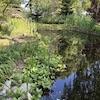 Ansprechende Außenanlage mit Teich, Sträuchern, vielen Obstbäumen und altem Baumbestand