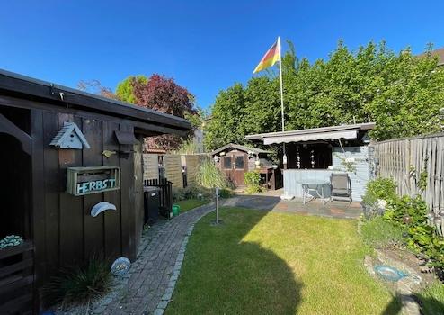 Über die Diele gelangt man in den offen gestalteten Wohn- und Essbereich, der eine angenehme Wohnatmosphäre schafft. Die angrenzende Küche führt direkt in den Wintergarten. Von hier aus genießt man den Blick in den liebevoll angelegten Garten. Im Gartenbereich befindet sich ein Carport mit Geräteschuppen, sowie zwei weitere Gartenhütten.