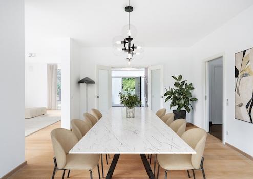 Mit einer Wohnfläche von ca. 375 m² bietet das Anwesen insgesamt acht großzügig geschnittene Zimmer und eine durchdachte Raumstruktur, die Familienfreundlichkeit, Eleganz und modernen Luxus vereint. Die klare Formsprache im Bauhausstil trifft auf ein warmes, einladendes Interior-Konzept – das Resultat: ein einzigartiges Zusammenspiel von Transparenz, Weite und Behaglichkeit.