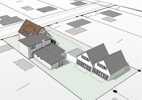 Es handelt sich um ein Hintergrundstück mit ca. 900 m². Es ist eine Bebauung mit einem Doppelhaus zulässig. Die nachstehende Darstellung bildet den Bestand des vorderen Grundstückes sowie das Baugrundstück nebst geplanten Neubau ab.