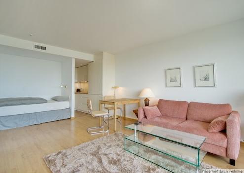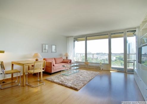 Eine schöne und sehr geschmackvolle Einrichtung, lichtdurchflutet (Südseite) und eine traumhafte Aussicht auf die City und den Rhein machen diese Apartmentwohnung im 15. OG einzigartig.