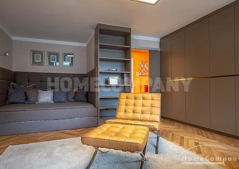 Wunderschönes, modern möbliertes 1-Zimmer-Apartment mit Balkon in Bogenhausen. 1. OG mit Lift. Der Wohn/Schlafbereich ist mit hochwertigen Designer-Möbeln ausgestattet und verfügt dank eines zeitlosen Einbauschranks mit Schiebeelementen über ausreichend Stauraum; von hier Zugang zum großzügigen Balkon. Die neue und in edlem anthrazit gehaltene Wohnküche besticht mit vielen Annehmlichkeiten: sämtliche Geräte/Utensilien für den täglichen Gebrauch (z.B. Geschirrspüler, Espressomaschine etc.) sind vorhanden, außerdem gibt es eine gemütliche Essecke für bis zu vier Personen.