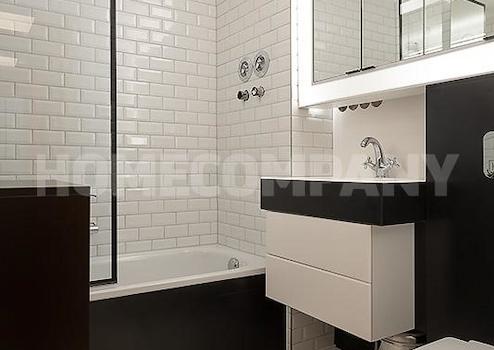 Das zeitlos schwarz-weiß gestaltete Badezimmer verfügt über eine Badewanne-Duschkombination, genügend Stauraum und eine eigene Waschmaschine. Die gesamte Wohnung ist qualitativ sehr hochwertig ausgestattet und versprüht einen besonderen Charme.