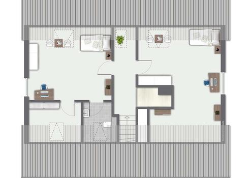 Das ausgebaute Dachgeschoss beherbergt weitere helle und freundliche Wohn- und Schlafräume sowie ein zusätzliches WC. Dank des gut durchdachten Grundrisses lässt sich diese Ebene flexibel nutzen – ob als Kinderbereich, Homeoffice oder Gästeetage.