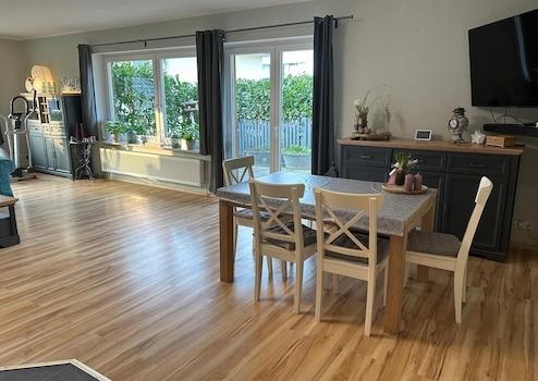 Das Erdgeschoss verfügt über einen Windfang, Diele mit offener Einbauküche, Tageslichtbad mit Wanne und wandhängendem WC, Schlafzimmer mit Zugang zur Terrasse, großzügiges Wohn- und Esszimmer mit Kaminofen und Ausgang zur Terrasse sowie 2 Kinderzimmer.