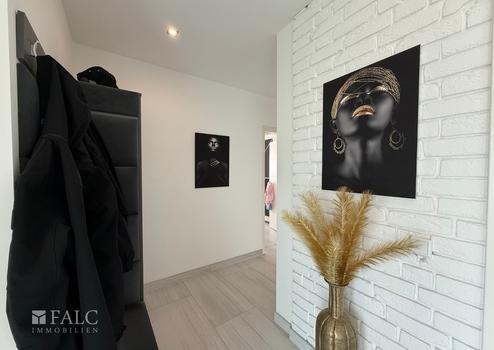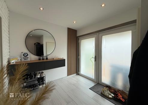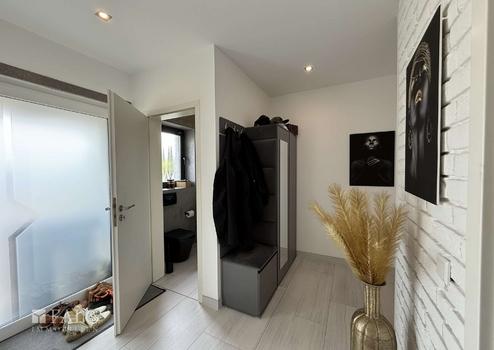 Beim Betreten dieser charmanten Erdgeschosswohnung mit eingenem Eingang aus dem Jahr 1983 erwartet Sie ein einladender Eingangsbereich, der mit modernen Akzenten und einer praktischen Garderobe ausgestattet ist. Von hier aus gelangen Sie direkt in das Gäste-WC, das mit stilvollen Armaturen und einem Fenster für natürliches Licht ausgestattet ist.