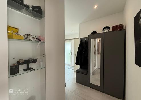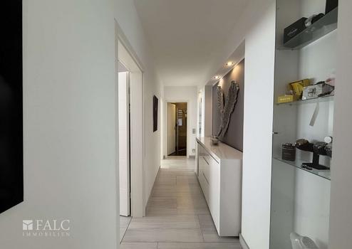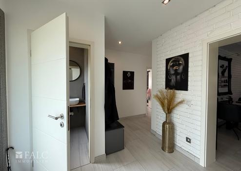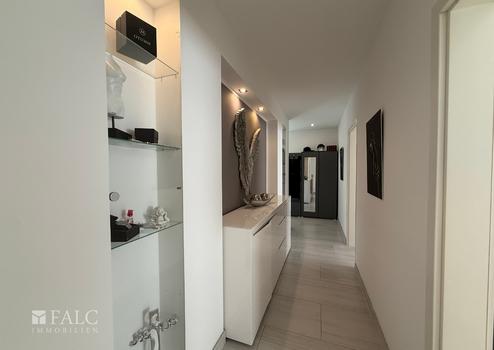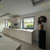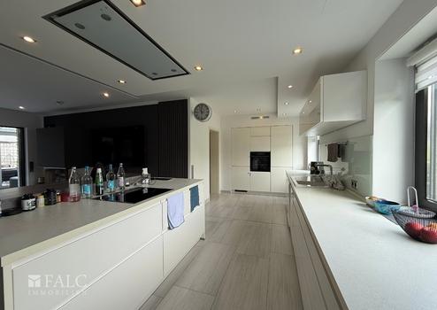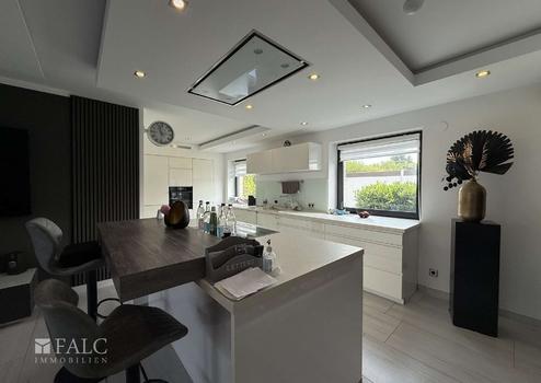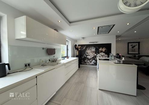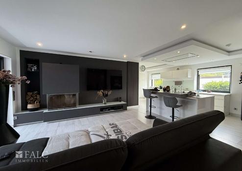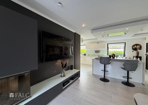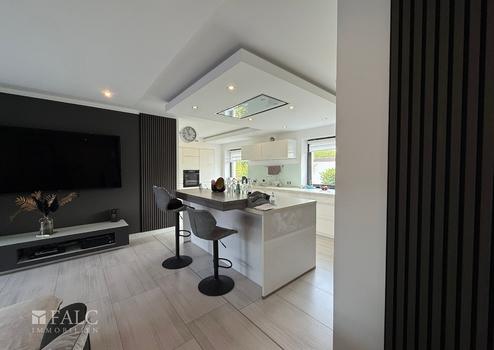 Der Flur führt Sie weiter in das großzügige Wohnzimmer, das mit einer offenen Gestaltung und großen Fenstern beeindruckt. Diese sorgen für eine helle und freundliche Atmosphäre. Der angrenzende Essbereich bietet ausreichend Platz für gesellige Abende mit Familie und Freunden. Die moderne Küche ist mit hochwertigen Geräten ausgestattet und bietet viel Stauraum sowie eine praktische Arbeitsfläche.