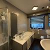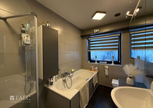 Das Hauptbadezimmer ist mit einer Badewanne und einer separaten Dusche ausgestattet und bietet ebenfalls ein Fenster für Tageslicht.