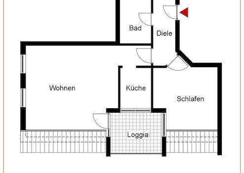 Die Wohnung empfängt Sie mit einer zentral gelegenen Diele, von der aus alle Räume zugänglich sind. Das Bad ist direkt gegenüber dem Eingang und mit Dusche, WC und Waschbecken ausgestattet. Rechts der Diele erstreckt sich der Wohn-/ und Essbereich, der Zugang zur Loggia bietet. Links liegt das Schlafzimmer, das über ein großes Fenster zur Loggia hin hell und freundlich wirkt. Die Küche ist funktional abgetrennt.