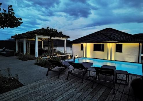 Der Außenbereich ist ein echtes Highlight: ein beheizter Pool, Außendusche, Sauna, eine hochwertige Outdoorküche sowie ein überdachter Essbereich mit großem Esstisch und einer Lounge - hier genießen Sie entspannte Stunden im eigenen Gartenparadies.