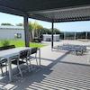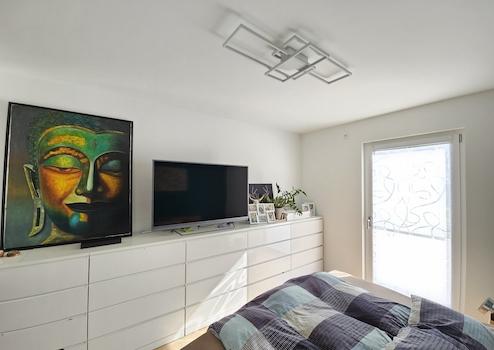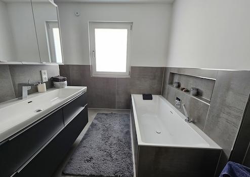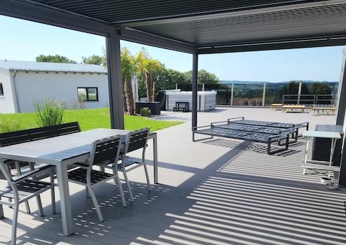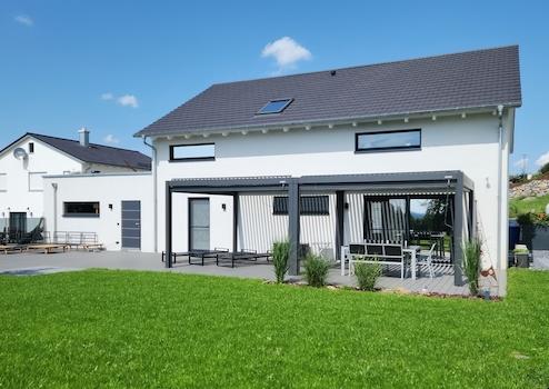 Die Wallbox in der großzügigen Doppelgarage bietet ihren ökologisch bewussten Bewohnern die Möglichkeit, ihr Elektroauto bequem und schnell zu Hause aufzuladen. Daneben eröffnet die Smarthome-Steuerung ganz neue Dimensionen des modernen Wohnens. Regulieren Sie die Temperatur, Lichtverhältnisse oder die Musikauswahl in Ihrem Zuhause bequem vom Smartphone aus und genießen Sie den Luxus des grenzenlosen Bedienkomforts. Die Fenster im Bad im Erdgeschoss können per Knopfdruck blickdicht geschaltet werden. Zu den weiteren Highlights dieser Immobilie zählen die installierten Klimaanlagen, die in der Sommerhitze eine wohltuende Abkühlung bieten. Hinzu kommt der durchdachte Schallschutz im gesamten Haus, der eine angenehme, ruhige Atmosphäre schafft. Das Äußere des Hauses ist kaum weniger beeindruckend als sein Innenleben. Die Regenwasserzisterne mit Gartenbewässerung versorgt Ihren Garten stets mit frischem Wasser und sorgt für ein kräftiges Grün. Der neue Rasenroboter erspart Ihnen das Mähen. Die Alarmanlage, die auch die Fenster umfasst, gibt Ihnen jederzeit ein gutes Gefühl der Sicherheit. Verbringen Sie entspannte Stunden unter der edlen Pergola, deren Lamellen regulierbar sind. Eine Seitenmarkise bietet bei Bedarf zusätzlichen Schatten.