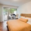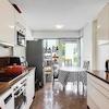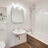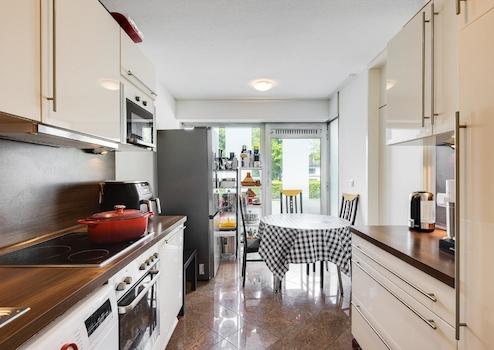 Ein ebenfalls mit Echtholzparkett und bodentiefen Fenstern ausgestattetes Schlafzimmer sowie ein modernes Bad mit Duschwanne runden das Raumangebot ab. Die restlichen Räume sind mit einem Granitboden ausgestattet, welcher der Wohnung einen Hauch von zeitloser Eleganz schenkt. Zum Inventar gehört auch eine gut ausgestattete Einbauküche.