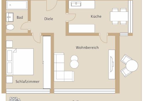 Von der einladenden Diele gelangen Sie praktischerweise in alle Räume, so auch in den großzügigen Wohnbereich, der mit stilvollem Echtholzparkett und einer bodentiefen Fensterfront mit Panoramaschiebetüren aufwartet. Einmal geöffnet, ermöglichen diese einen direkten Zugang zum weitläufigen Balkon, der Ihnen an schönen Tagen eine ideale Möglichkeit bietet, das Leben nach draußen zu verlagern und neue Kraft zu tanken.