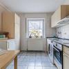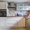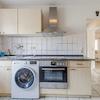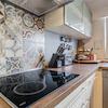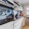 Küche mit gepflegter, einfacher Einbauküche, ausgestattet mit Backofen, Induktionskochfeld, Kühlschrank und Dunstabzugshaube