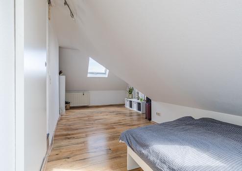 Schlafzimmer mit Laminatboden, Einbauschrank und zwei Dachfenstern