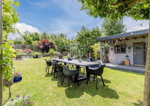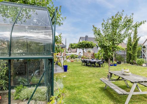 Der Außenbereich passt sich dem großzügigen Charakter des Hauses perfekt an. Der tief angelegte, gepflegte Garten vermittelt echtes Urlaubsgefühl, verfügt über eine gemütliche Lounge-Ecke und einen zusätzlichen Abstellraum. Vor dem Haus gibt es eine breite Einfahrt, einen Carport und eine Garage – so wird das Parken zum Kinderspiel.