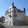 # die Fassade des linken Hauses hat Denkmalschutz
