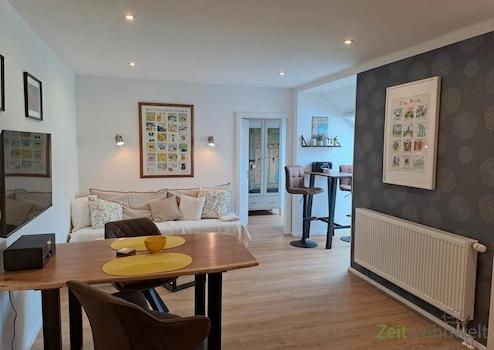 ### Please note the availability date! Bitte das Verfügbarkeitsdatum beachten! ### höbsche möblierte Wohnung in ruhiger Wohnlage in Waldkappel; WLAN; großes Wohnzimmer mit modernen rustikalen Möbeln, Sofa, Esstisch, ...