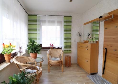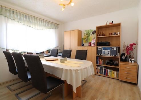 Das Wohnhaus wurde 1984 in massiver Bauweise mit Vollkeller errichtet. Es hat mit 5 Zimmern, Küche, Bad, Gäste-Bad und Fluren eine Größe von ca. 117 m². Der Keller hat mit Heizungs-, Wirtschafts-, Hobby- und Hausanschlussraum eine Größe von ca. 78 m².
