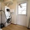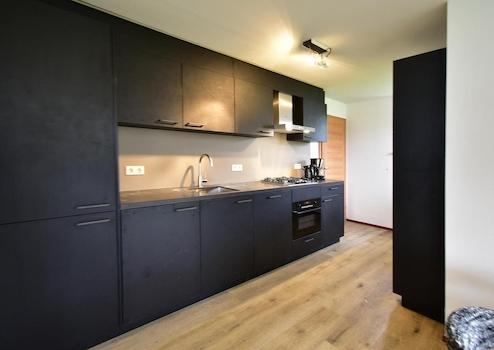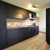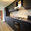 Schöne große geradlinige Küche. Natürlich mit Einbaugeräten wie 4-Flammen-Herd, Geschirrspüler, Dunstabzugshaube aus Edelstahl, Kühlschrank mit Gefrierfach und einer Kombi-Mikrowelle. Durch die Küche gelangt man in den Abstellraum, wo sich die Waschmaschine und der Trockner befinden.